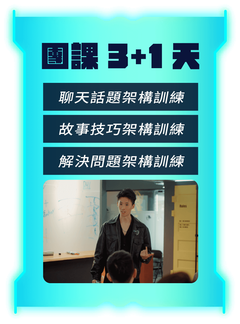 你不再被上司、同事或客戶催促「講重點」;運用這套溝通表達架構,你將能在瞬間整理腦海中的資訊,將故事講得引人入勝,讓她(或他)全程專注,並真正看到你的價值。 這裡我們結合了正反面說話卡牌遊戲的精華 —👉 反轉與對比 : 「我原本以為…但後來發現…」的模式,讓對話充滿懸念和深度,讓聽者在意外與驚喜中體會你的成長👉 客觀與主觀融合 : 「客觀來說,主觀來說」的框架,既展示事實又呈現你的獨特見解,讓你理性又富有情感👉 動機與比喻起步 : 「一切都從一個動機開始」出發,再用「我之前是…但經歷過XXX,我現在覺得...」,或用生動的比喻凸顯差異,讓你講出來的每一句話都具邏輯又引人共鳴 把你腦中的畫面,置入到女人的腦海中🟠 結構化表達訓練:透過反覆練習,讓你在臨場時迅速組織思路,從容應對各種情境。🟠 現場互動模擬:借助卡牌遊戲的練習模式,讓你學會如何在對話中靈活切換模式,既幽默又直擊重點。🟠 持續反饋與優化:利用錄影和實戰回顧,不斷精進你的表達技巧,確保每次講述都能打動人心。
